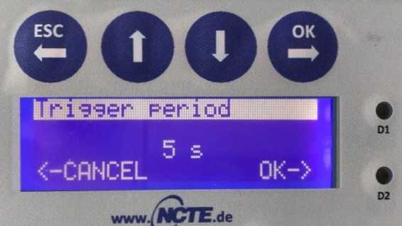 按OK鍵進(jìn)入Trigger period里面,按上下鍵設(shè)置時(shí)間為5~10s(可根據(jù)測試間隔設(shè)定)按OK確認(rèn)